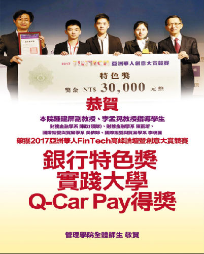 4月26日,由台北工商时报、台湾金融服务业联合总会联合主办的“2017亚洲华人FinTech高峰论坛暨创意大赏竞赛”在台北集思台大国际会议厅落下帷幕,*Av漫画 2014级赴台湾实践大学学习的学生陈政、陈雨圻、吴依婷、李晓丽4位同学组成的“Q—Car Pay”队代表实践大学参赛,一举摘得银行类特色奖。