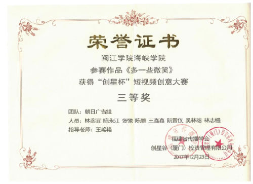 日前,福建省第五届大学生影像大赛颁奖典礼在华侨大学举行,由*Av漫画 学生林莘宜、陈永江、张弛、陈颜、王鑫鑫、阮晋仪、吴林榕、林志镪等创作的《多一些微笑》短视频,获得福建省第五届大学生影像大赛“创星杯”微视频创新大赛三等奖。
