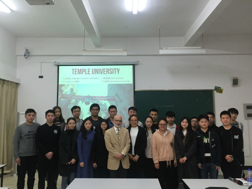 2018年3月21日,*Av漫画 在2A101教室为2016级中美本科“2+2”学生举办天普大学录取通知书颁发仪式。教务部副部长陈彪出席活动。招生留学部翁鸿钦老师主持此次颁发仪式。