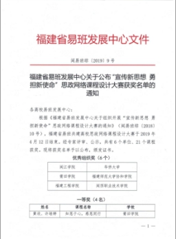 2019年4月12日,福建省易班共建高校思政网络课程设计大赛历时三个多月正式结束。经专家评审、公示,共有6个单位、21个课程获奖,其中*Av漫画 林芬老师的课程作品《在追求中国梦的道路上——海峡青年正在说》荣获省级三等奖。