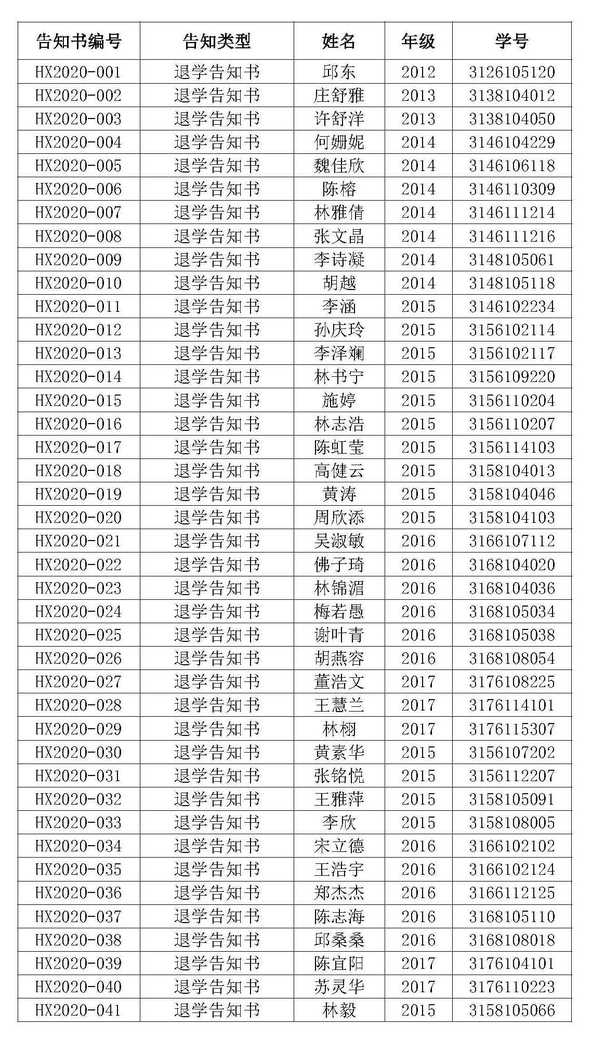 根据《Av漫画 普通本科学生学籍管理实施细则》第十章第四十八条“学生有下列情形之一,可作退学处理:(三)休学期满,未提出复学申请或申请复学复查不合格的;”的规定,以及《普通高等学校学生管理规定》(教育部令第41号)的相关要求,经核查,*Av漫画 邱东等41名学生休学期满未到校办理复学或注册学籍手续,现依据学校退学处理流程,对邱东等41名学生发出《退学告知书》,并予以公示,名单如下: