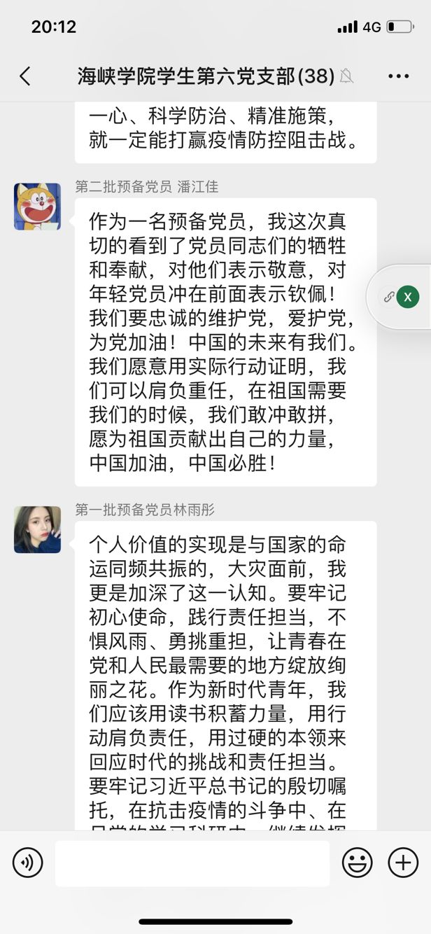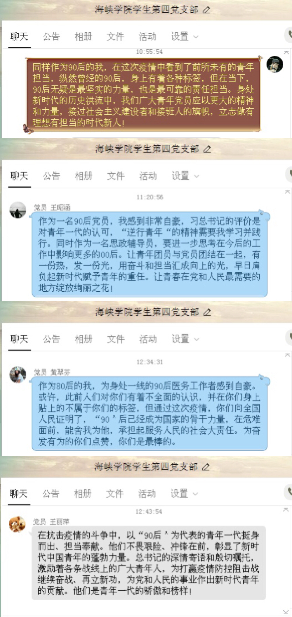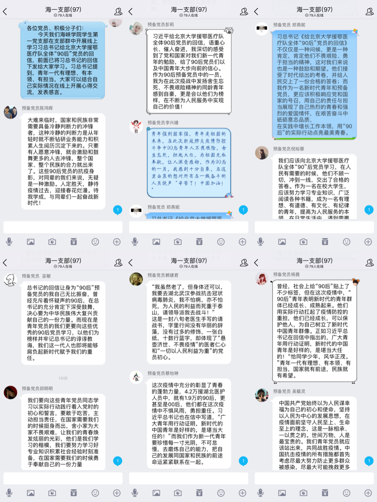 党委组织各学生党支部开展线上学习习近平总书记给北京大学援鄂医疗队全体“90后”党员的回信,同时,开展心得交流,发表感言。