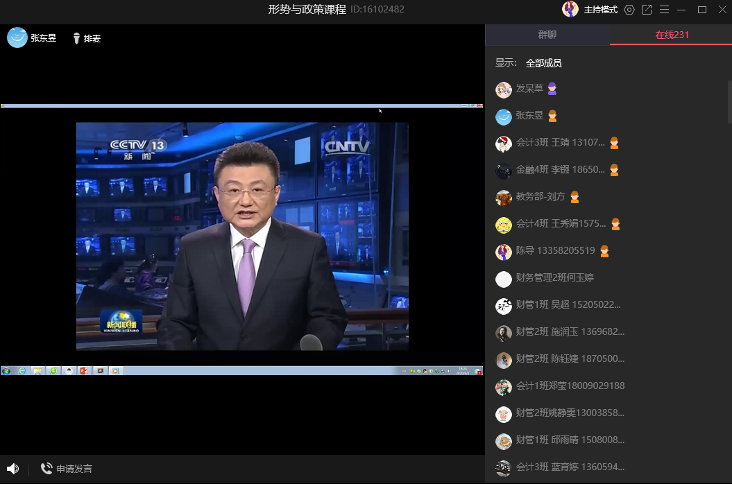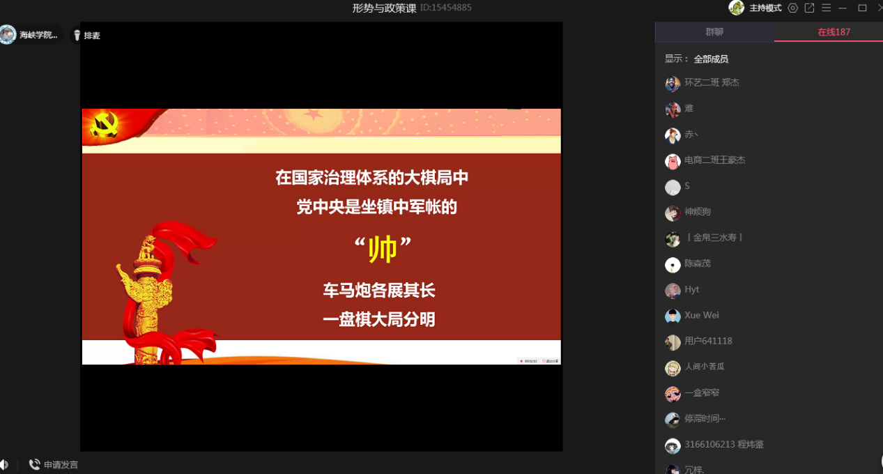 为进一步学习贯彻落实十九届四中全会精神,加强对毕业班学生的教育管理,近期,*Av漫画 党委张东昱书记、李廷旺副书记分别对2020届毕业生进行形势与政策课的线上授课。