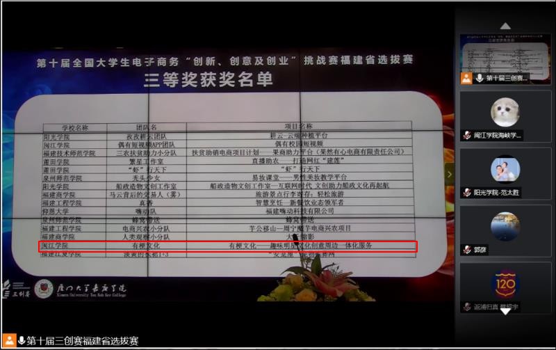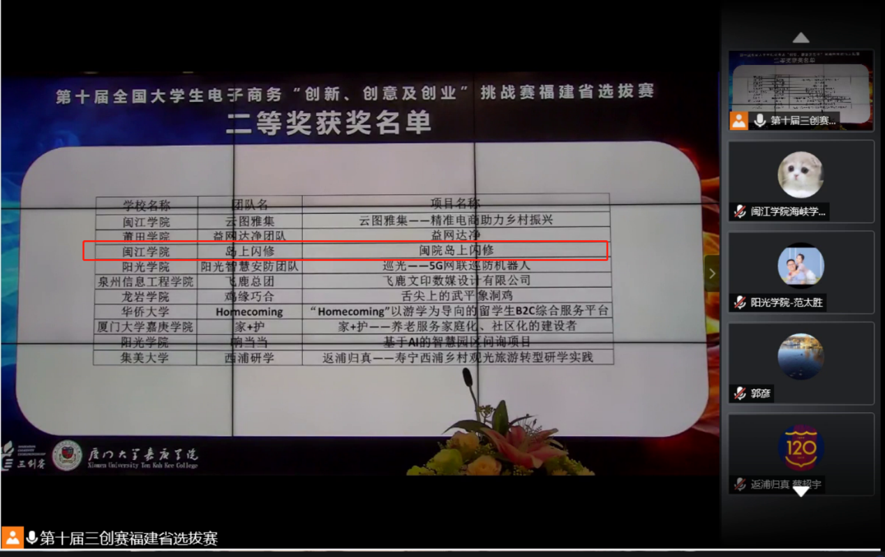 比赛结束后,主办方进行了闭幕式暨颁奖典礼。最终,Av漫画 《闽院岛上闪修》、《你好漂亮APP》两个项目团队荣获二等奖;《有梗文化—趣味明星文化创意周边一体化服务》项目团队荣获三等奖。