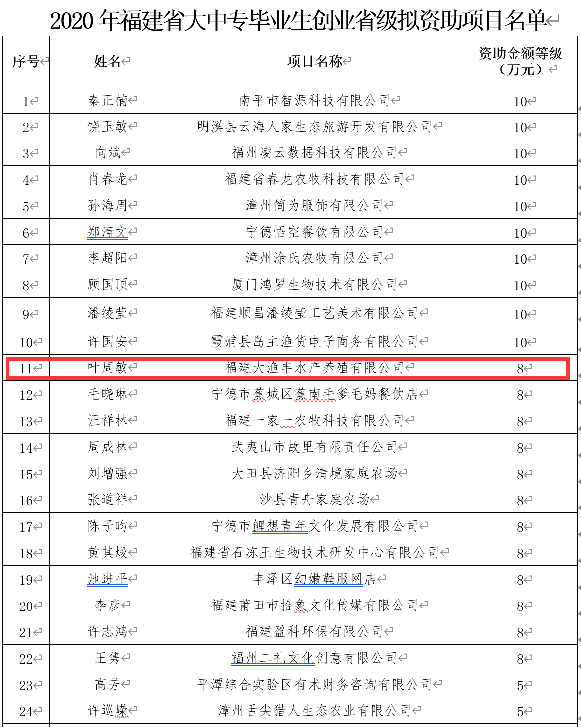 近日,福建省人力资源和社会保障厅公示了“2020年大中专毕业生创业省级拟资助项目名单”,此次公布的名单项目是根据省委、省政府下发的评审文件要求,并经过网上申报、资格审核、书面评审、实地考察、现场答辩和会议研究等程序的层层考察,确定的1102020年拟资助省级项目,其中Av漫画 2019届工商管理专业校友叶周敏的“福建大渔丰水产养殖有限公司”项目获得8万元的资助金额,位列资助金额等级第二(并列)。