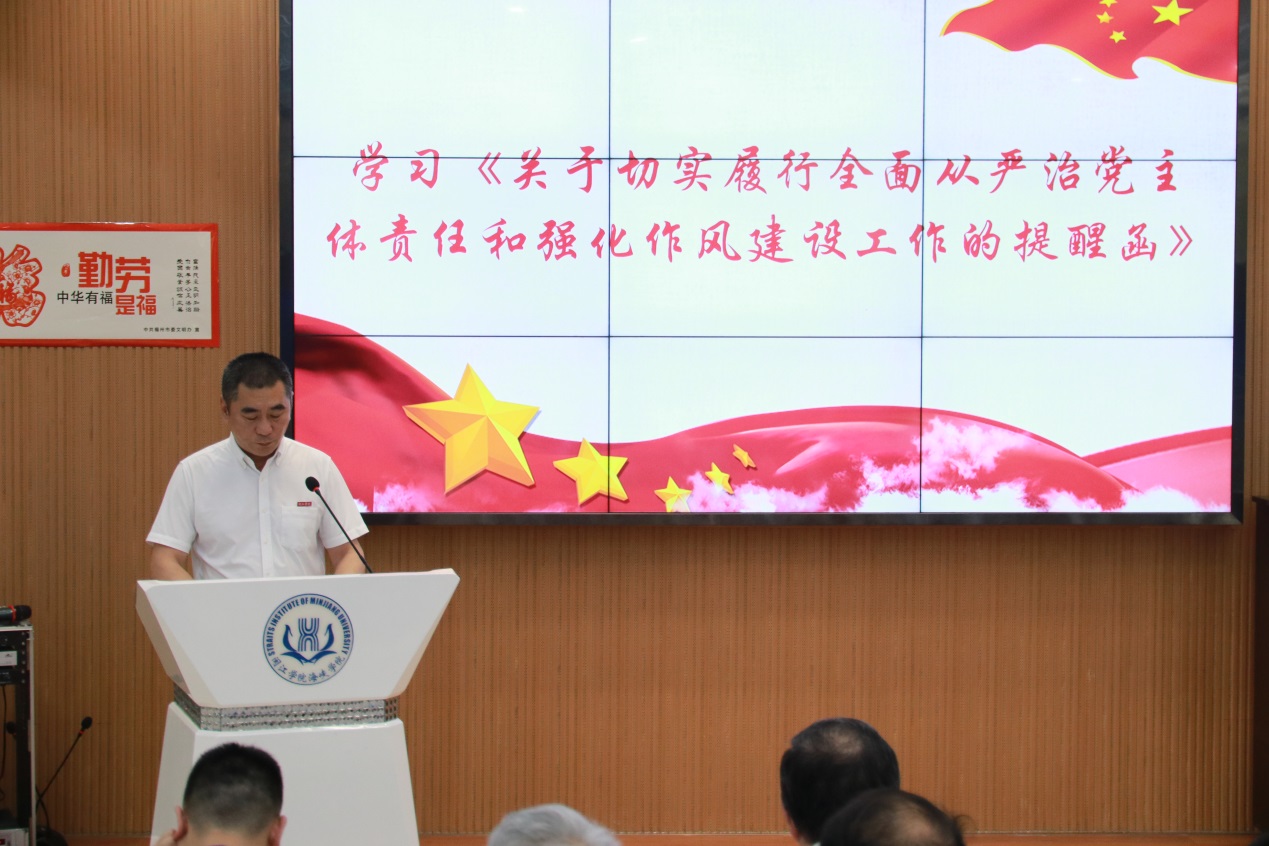 首先,由张东昱书记传达学习《关于切实履行全面从严治党主体责任和强化作风建设工作的提醒函》。他强调,一要抓好师德师风建设,二要营造良好教学科研氛围,三要加强科研经费使用管理,四要确保校园安全稳定有序,五要筑牢重点领域和关键岗位廉政风险防线。