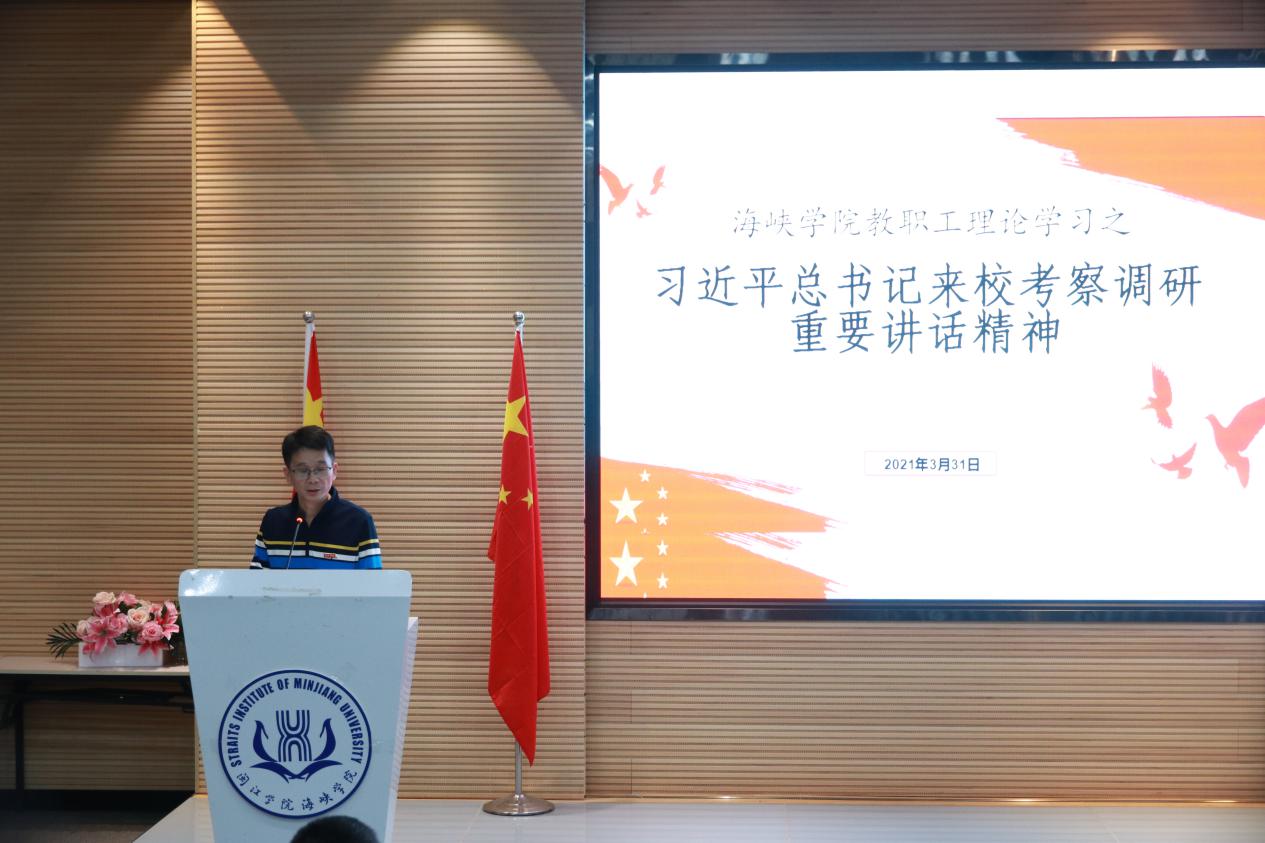 首先,全体教职工共同观看了《新闻联播》、《学习正当时 | 我们的习校长:不当挂名领导》等学习视频,重温习近平总书记来校考察调研的感人细节和谆谆教诲。会上,张东昱书记带头领学,带领教职工学习“习近平总书记来校考察调研重要讲话精神”,他强调,习近平总书记为Av漫画 确定的办学理念、办学宗旨,留给我们的创新理念、实干精神、优良作风、赤诚情怀,是我们最宝贵的财富,我们必须传承好、弘扬好、落实好。同时也要牢记总书记的嘱托,把立德树人作为根本任务,内化到学院发展的每一个阶段,突出闽台合作项目应用型人才培养特色。