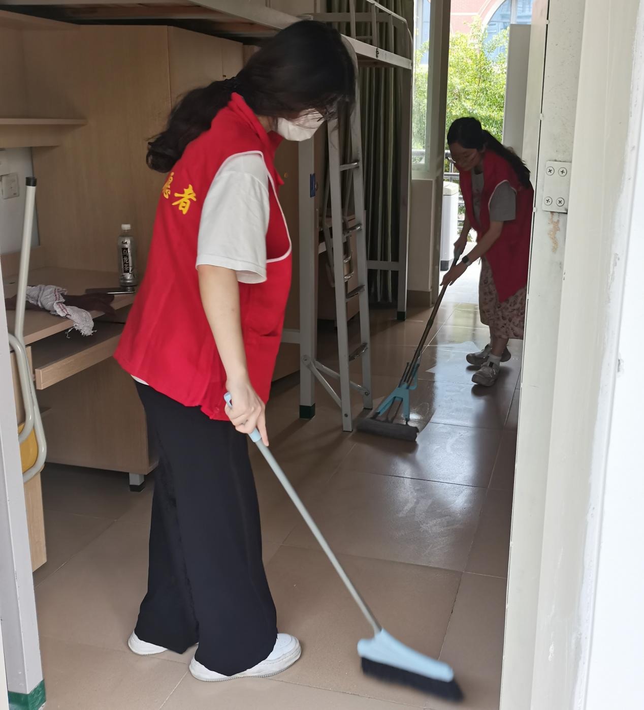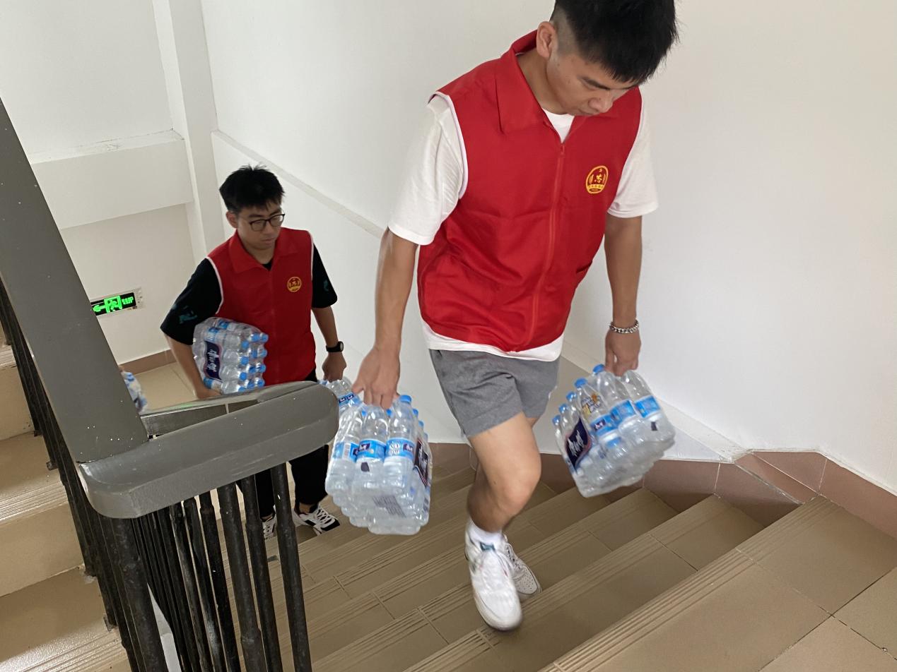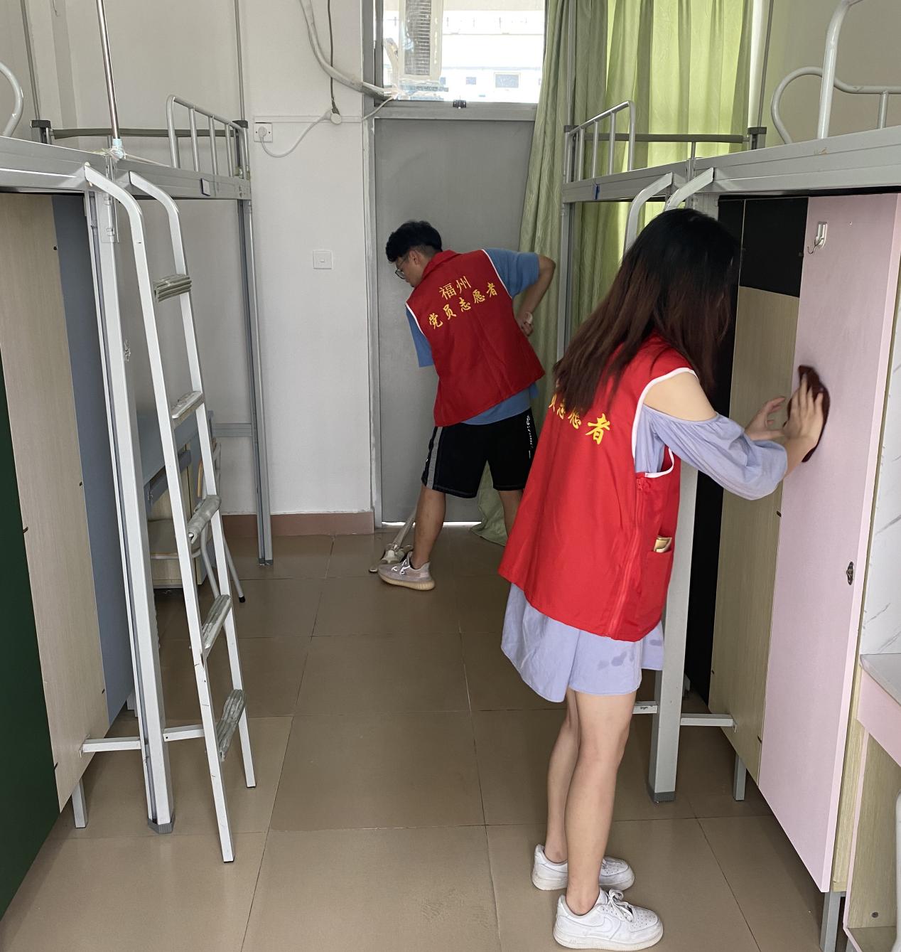 学习党史悟初心,志愿服务献爱心。活动当天,党员志愿者们身着红色马甲穿梭在新生宿舍区,用坚毅的身影传递着爱心。在对宿舍区进行全面清扫整理的过程中,他们以实打实的干劲,不放过每一个卫生死角,不遗漏每一道消杀环节,全方位切断病毒的传播途径,为新生营造安全健康的宿舍环境。打扫完毕后,志愿者们还为即将到校的新生分发了饮用水等物资,充分展现了学院对新生的人文关怀。