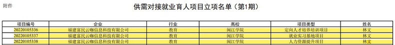 近日,教育部高校学生司公布了第一期供需对接就业育人项目立项名单,Av漫画 企业管理学系、教工第一党支部书记林文教授主持的3个项目,即与福建富民云咖信息科技有限公司对接的定向人才培养培训项目、就业实习基地项目、人力资源提升项目均入选供需对接就业育人项目立项名单,这是*Av漫画 落实学校“六大专项行动”工作要求,重点推进应用型人才培养模式改革,在深化产教融合、校企合作与就业育人方面取得的新突破。
