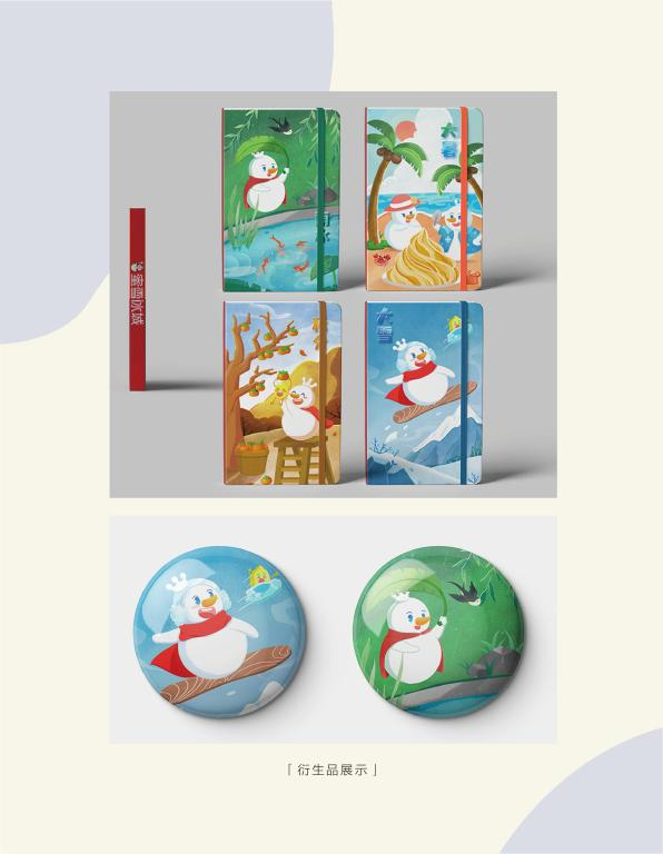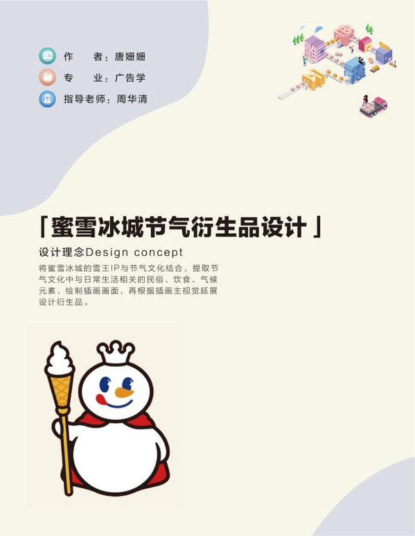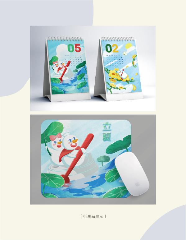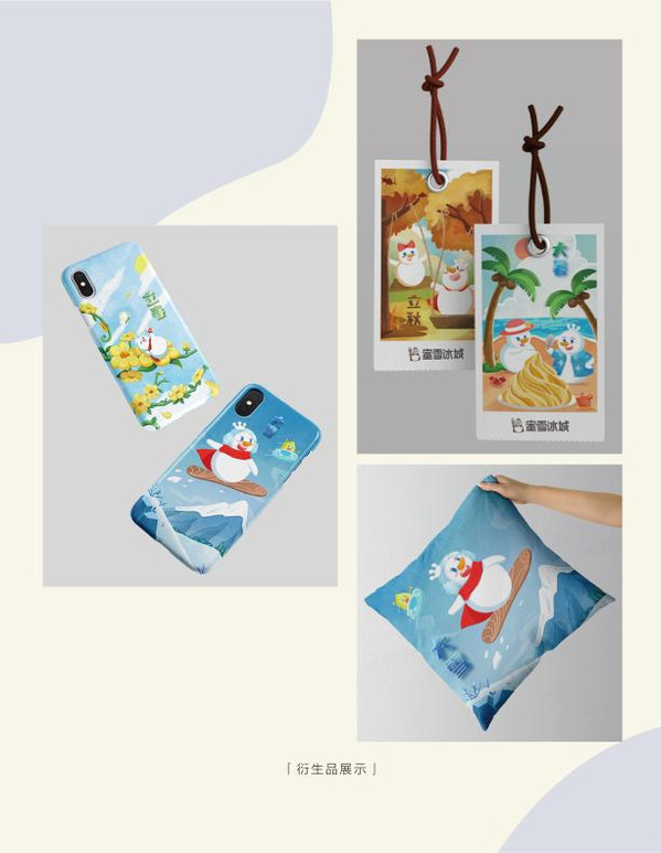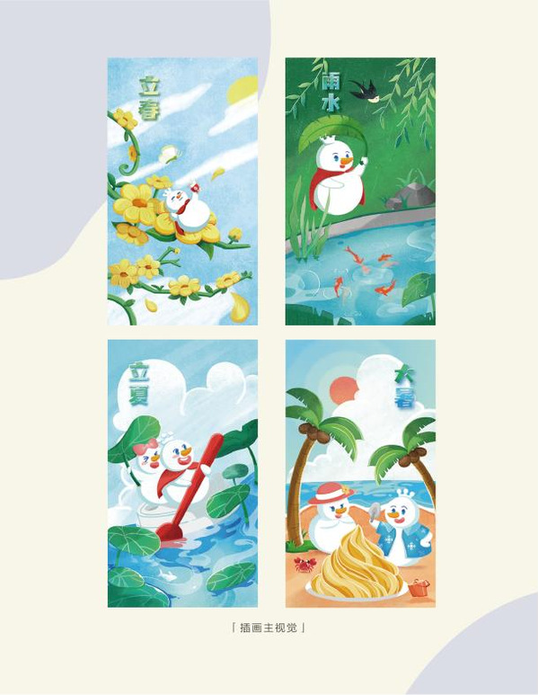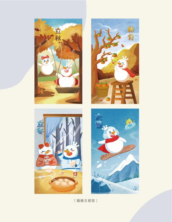 设计说明:本作品将蜜雪冰城的雪王IP与节气文化结合,绘制插画主视觉,设计衍生品。
