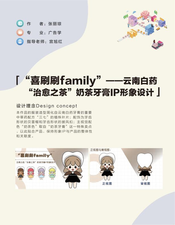 设计说明:本作品的服装造型简化自云南白药牙膏的重要中草药配方“三七”的植株叶片;配饰为牙齿形状的贝雷帽和牙齿形状的披风扣;主视觉配色“奶茶色”取自“奶茶牙膏”这一特殊卖点,以此贴合产品,保持形象IP与产品的整体性和关联度。