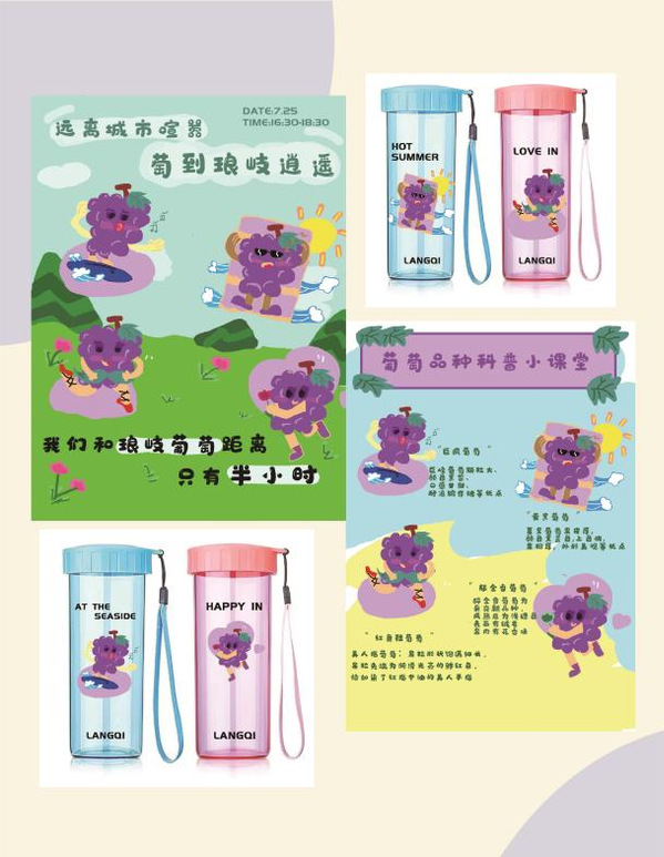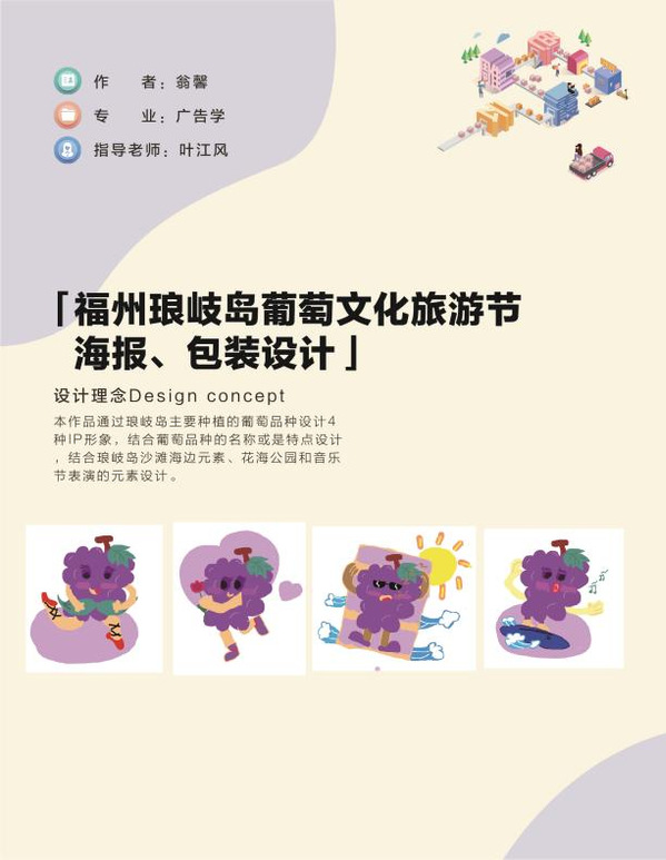 设计说明:本作品通过琅岐岛主要种植的葡萄品种设计4种IP形象,结合葡萄品种的名称或是特点设计,结合琅岐岛沙滩海边元素、花海公园和音乐节表演的元素设计。制作标语。