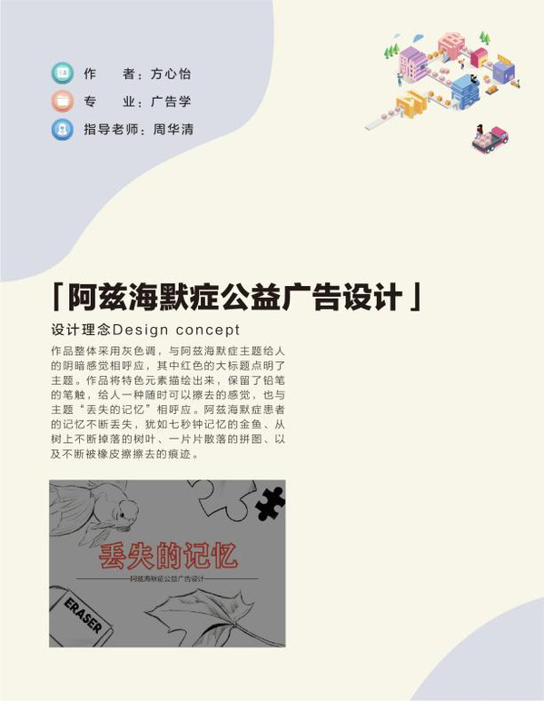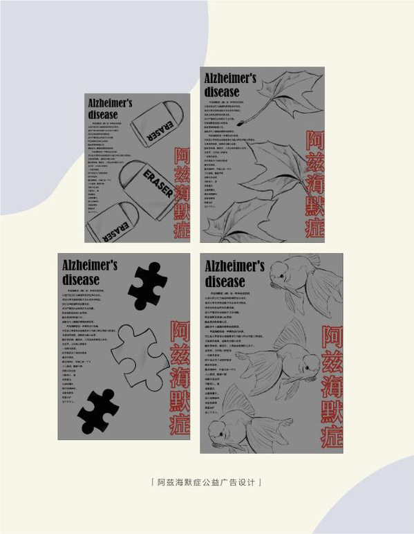 设计说明:作品整体采用灰色调,与阿兹海默症主题给人的阴暗感觉相呼应,其中红色的大标题点明了主题。作品将特色元素描绘出来,保留了铅笔的笔触,给人一种随时都可以擦去的感觉,也与主题“丢失的记忆”相呼应。阿兹海默症患者的记忆不断丢失,犹如七秒钟记忆的金鱼、从大树上不断掉落的树叶、一片片散落的拼图以及不断被橡皮擦擦去的痕迹。