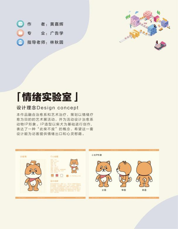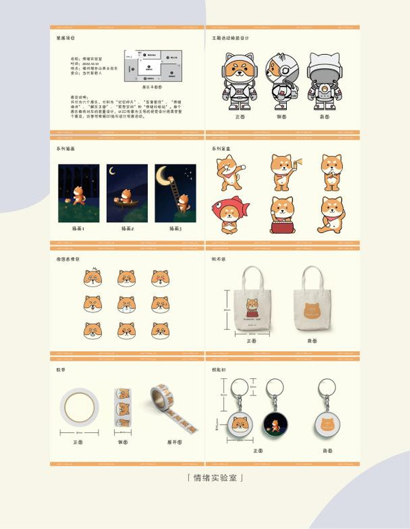 设计说明:本作品融合治愈系和艺术治疗,策划以情绪疗愈为目的的艺术展活动,并为活动设计治愈系动物IP形象。IP造型以柴犬为基础进行创作,表达了一种“废而不柴”的概念,希望这一套设计能为访客提供情绪出口和心灵慰藉。