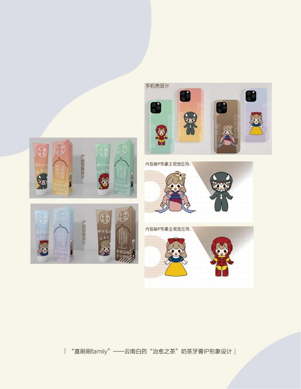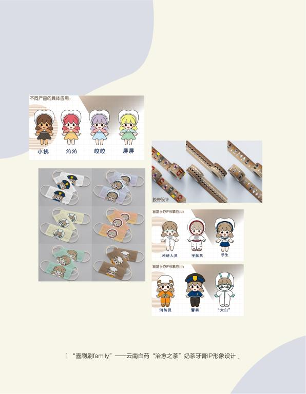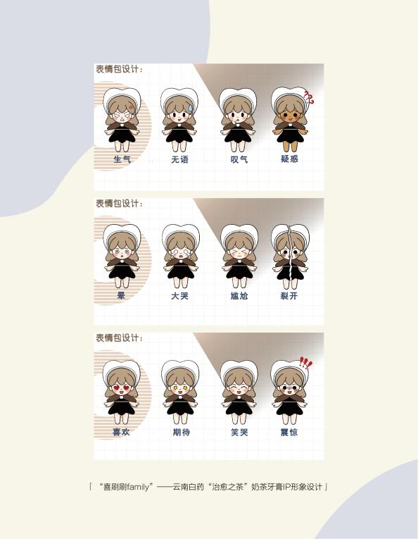 作品名称:“喜刷刷family”——云南白药“治愈之茶”奶茶牙膏IP形象设计