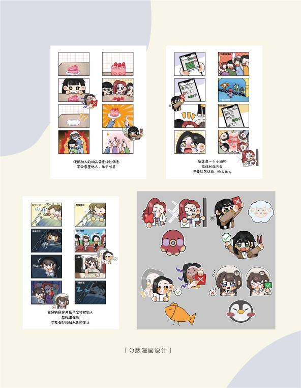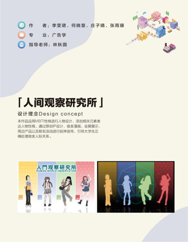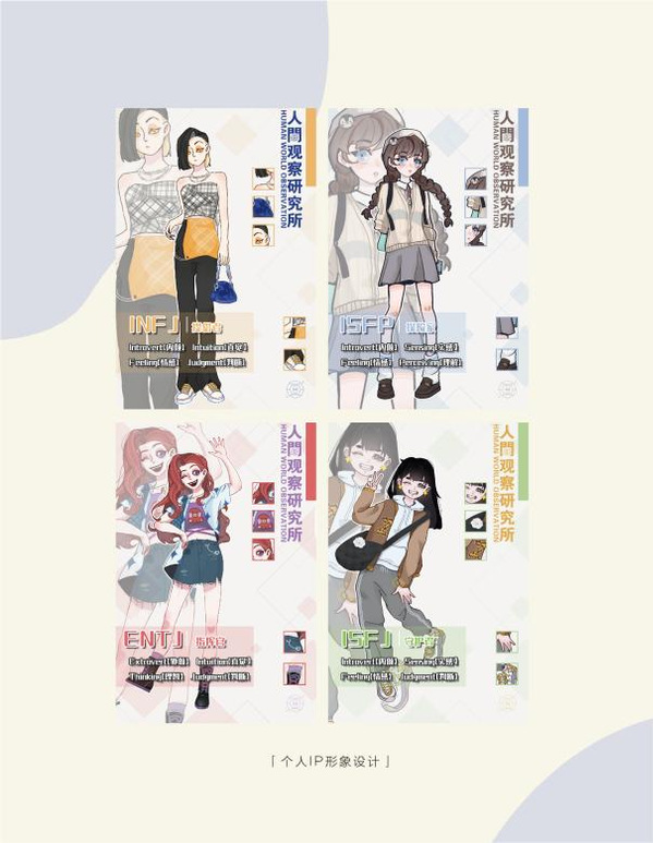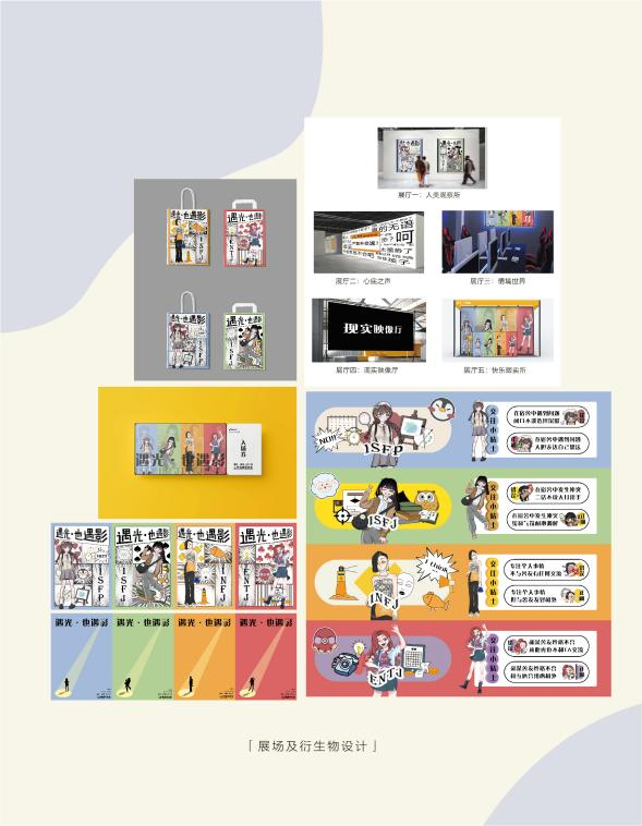 设计说明:本作品运用MBTI性格进行人物设计,添加相关元素表达人物性格,通过原创IP设计、宿舍漫画、会展展示、周边产品以及联名活动进行延伸宣传,引导大学生正确处理宿舍人际关系。