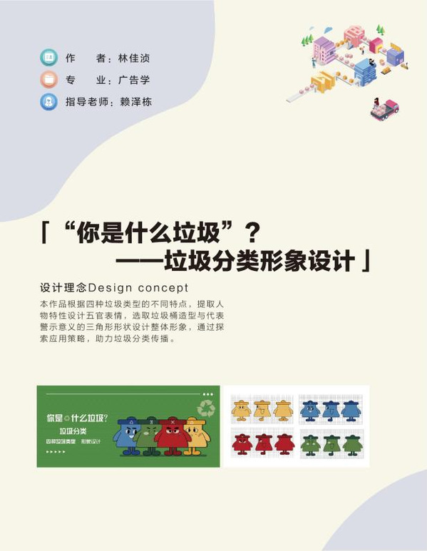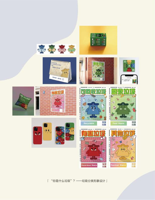 设计说明:本作品根据四种垃圾类型的不同特点,提取人物特性设计五官表情,选取垃圾桶造型与代表警示意义的三角形形状设计整体形象,通过探索应用策略,助力垃圾分类传播。