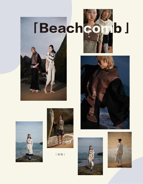 设计说明:赶海对于一部分人来说是周末放松释放压力的好项目,他们在捕捞海洋生物的同时收获了满足感,而渔民赶海是是他们生活的经济支撑。灵感上将“赶海”逐步延伸到现实生活中人们与日常学物的复杂关系,人们在生活中被许多事物和人际关系掴绑难以逃脱的现象就像赶海被渔网捕捞中的生物,作为一生都在赶海的渔民就像朝九晚五工作的职员一样,日复一日做着索然无味的工作,处理人与人的关系,偶尔也会被生活小事打击,却依然逆来顺受,做自己生活道路的“赶海人”。