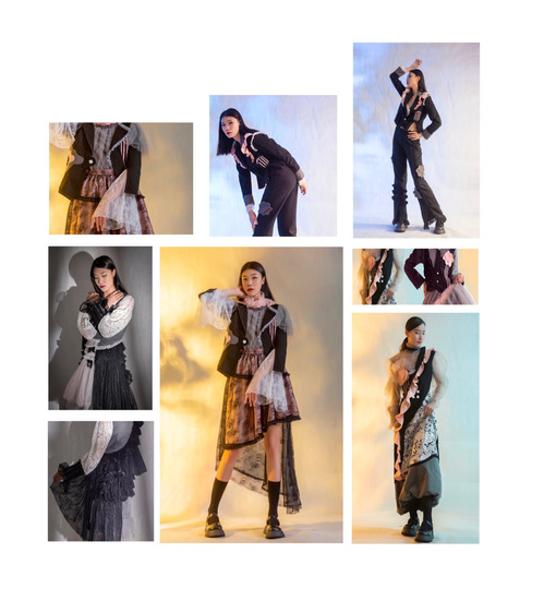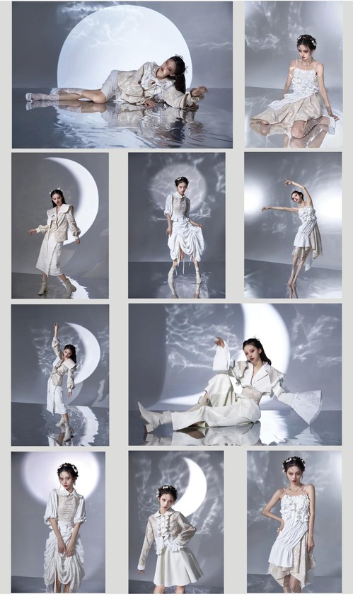 设计说明:《月》其实是隐喻,指的是阿尔忒弥斯,她不仅仅代表少女的纯洁,也是象征自由与独立的大自然女神。因为整套服装是想体现“如月光一般皎洁的少女”,而“月”首先就让我联想到的关键词就是温柔与纯洁,于是我就将整套服装主调定为白色系。而如今随着东西方文化交流的日渐频繁,新风格的服装出现强烈的西化倾向,少女风格逐渐多元化,也许这就像古希腊月神阿尔忒弥斯的性格里,既有混沌野性的一面,也有丰产美丽的一面。所以我试图打破对女性应有风格的传统观念,把中西服装的风格与文化进行有机结合,将少女元素解构、重塑,把褶皱、绑带等少女元素通过精细工艺和特殊面料来呈现出我眼中的少女风格。