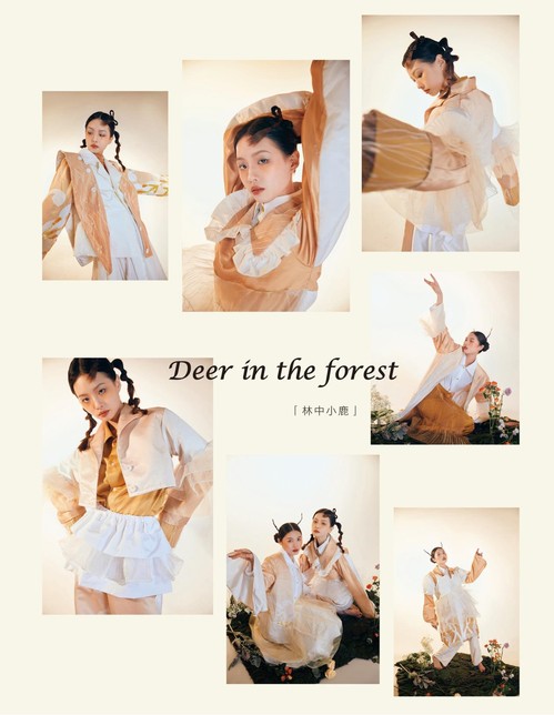 设计说明:从当下人与自然的割裂状态出发,感受大自然生命流动与现代化社会印记为设计理念并以此进行系列设计。现代社会的巨大压力,让人们越发渴望一种“慢生活”,渴望田园生活,感受自然,享受自然。“林深时见鹿,溪午不闻钟”恍惚间,匆忙的人们在虚幻中化作一只自由的林中小鹿,斑驳日光,慵懒穿梭于森林之中,放慢脚步,细嗅空气芬芳,品味生活,享受自然。