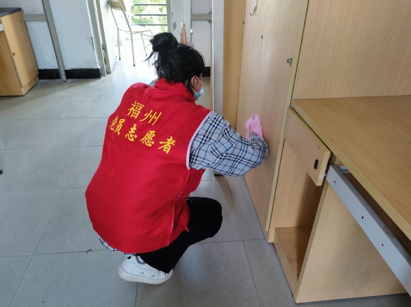 志愿服务暖起来,共绘闽院新气象。活动当天,最美的“志愿红马甲”成了宿舍区一道亮丽的风景线,党员们通过自己的实际行动,向新生传递温暖与爱心。党员志愿者们在打扫时,每个细节都不放过,每个角落都不错过,他们拎着清扫工具奔走在各个宿舍间,提着水桶、拿着抹布为新生们擦拭床板、桌面,并用酒精仔细做好消毒工作。每一间焕然一新的宿舍,是志愿者们留给新生们最爱的礼物,同时也是他们对新生们寄予的殷切期望。