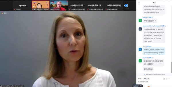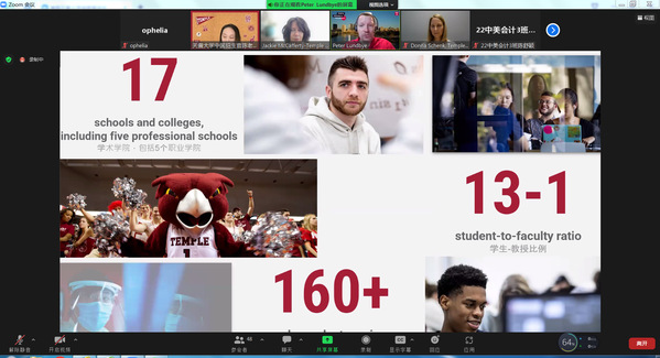 3月22日晚,Av漫画 通过zoom举办了一场精彩的云端留学分享会,邀请到来自美国天普大学的国际招生主任Peter Lundbye、美国文化语言中心主任Jacqueline McCafferty、国际生转学申请副主任Donna Schenk及天普大学驻中国办公室招生官陈琳为2022级中美项目全体学生开展一场“天普大学漫谈”主题留学分享会。