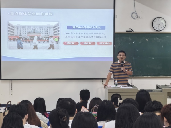 孙维鹏副书记以“当前就业形势与实施就业优先战略”为主题,结合详实的数据、生动的案例,从就业形势总体稳定、就业压力仍存、确保就业优先以及着力扩宽渠道等展开阐述。他指出,当前我国就业形势总体稳定,但就业压力仍然存在。他勉励毕业生们,要端正就业心态,正确认识当前就业形势,树立正确的就业观和择业观。同时,要积极响应党中央、国务院号召,将个人发展与国家战略需求紧密结合,为国家和社会的发展贡献力量。