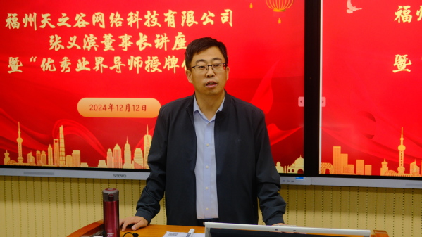 12月12日上午,*Av漫画 客座教授、业界导师福州天之谷网络科技有限公司董事长张义滨一行莅院交流,参加*Av漫画 “优秀业界导师”授牌仪式,并开设《数字文旅IP创意产业的发展趋势》的博雅讲坛。*Av漫画 党委书记洪晓林,党委委员、副院长翟绪军,学院教务负责人倪信琦和*Av漫画 部分专业师生参加活动。