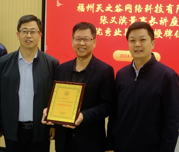洪晓林书记、翟绪军副院长为张义滨董事长颁发*Av漫画 “2023-2024年度优秀业界导师”荣誉牌匾,感谢他为Av漫画 广告学专业学生在专业实习实践、参加福建文创奖等赛事的相关活动以及专业培养方案和数字化内容建设等方面等作出的指导、努力和贡献。
