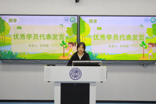 过后,仪式便来到了第二阶段——强青班优秀学员许宇茹代表上台发言。学员许宇茹谈到,通过在强青班的学习生活,自己从原先内耗缄默的状态逐渐转化成了自信、不妄自菲薄的性格。这一年在参与强青班的各个社会实践、志愿活动的过程当中,自己不仅拓眼界、长见识,也慢慢地建设起了自身强大的内核。此外,学员许宇茹阐释了自己通过强青班这一渠道初步接触义工服务的感受、实践劳动过程中的酸涩艰苦、拓宽眼界的震撼满足,以及班级是如何促使她撕破自身“笨”、“慢”的标签,在这之中获得成长。