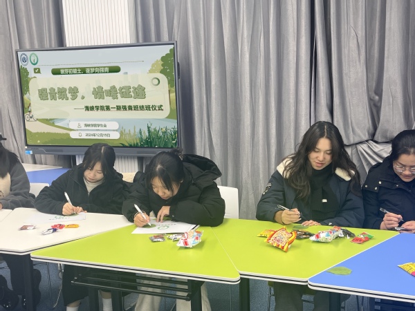悉数言语之间,结班活动也已进行过半。班主任林梦婷老师为全体学员颁发结业证书,并根据日常表现及出勤率评选出6位优秀学员。活动最后,成员们在青叶状的便签上写下自身对过去的所悟所念、对未来的规划与心中所期,并携手在“强青小苗”贴上一片片绿叶,绵延恒生,使其成长为一棵屹立坚韧的大树——宛如强青班学子绚烂缤纷的未来,常青如故,后会有期。