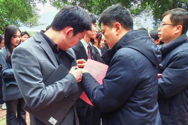 仪式在激昂的《国际歌》歌声中拉开帷幕。翟绪军副院长宣读了新发展的预备党员名单。在孙维鹏副书记的带领下,预备党员面向党旗,庄严宣誓,在场的老党员也一同重温入党誓词,回忆入党初心。誓言声声坚定,传递出对党的忠诚和为共产主义奋斗终身的坚定决心。 随后,在场领导老师们为新发展党员佩戴党员徽章。
